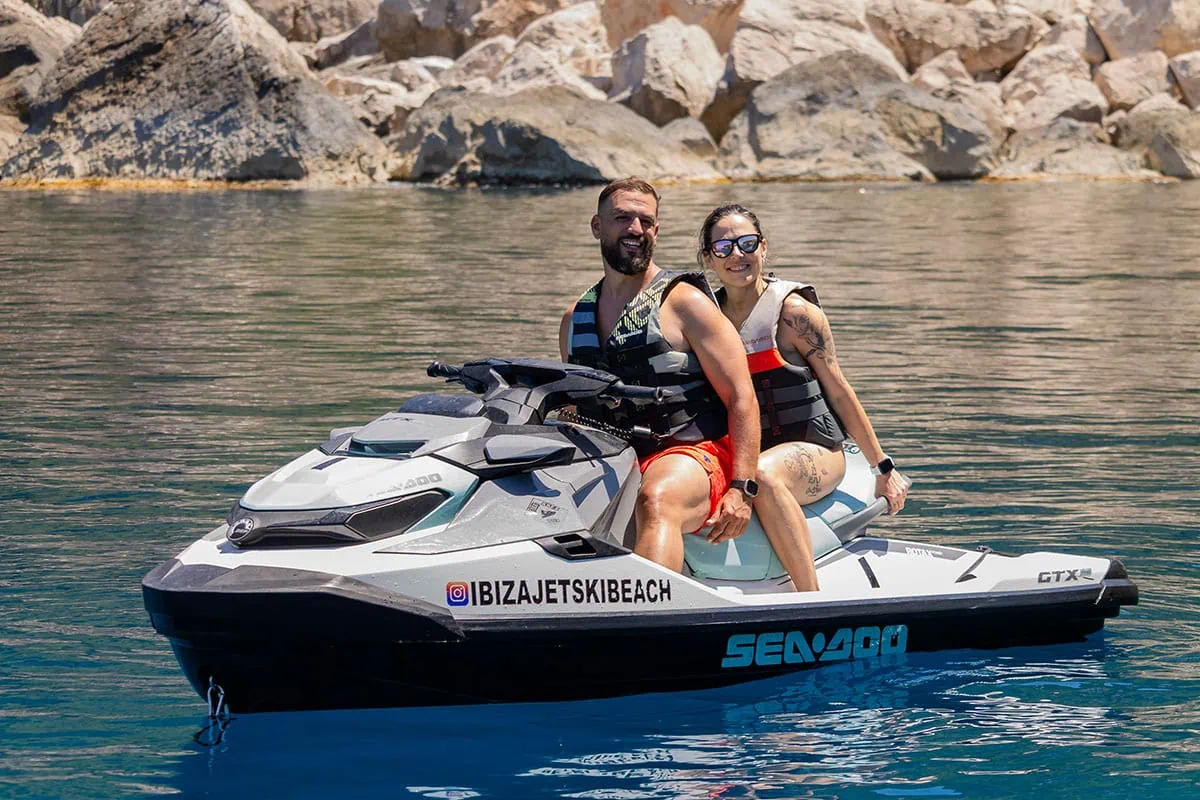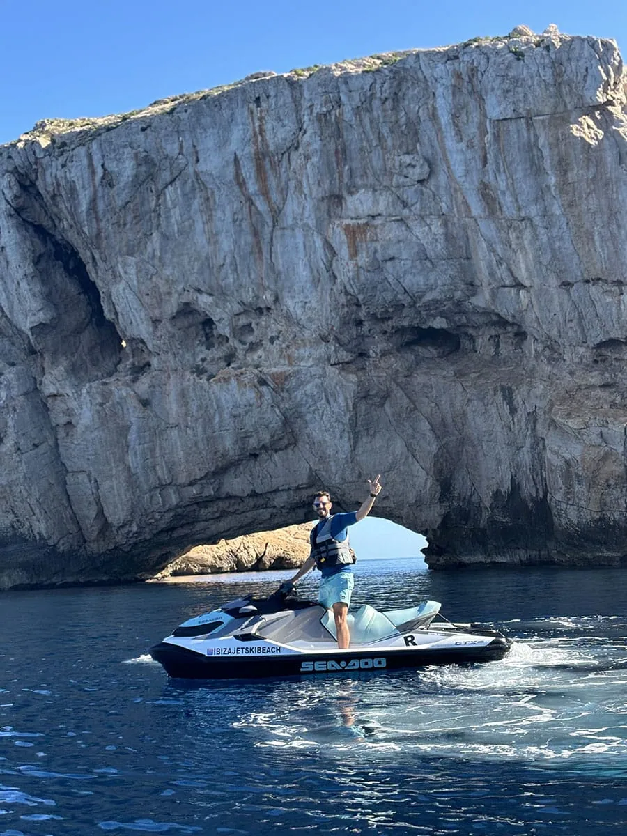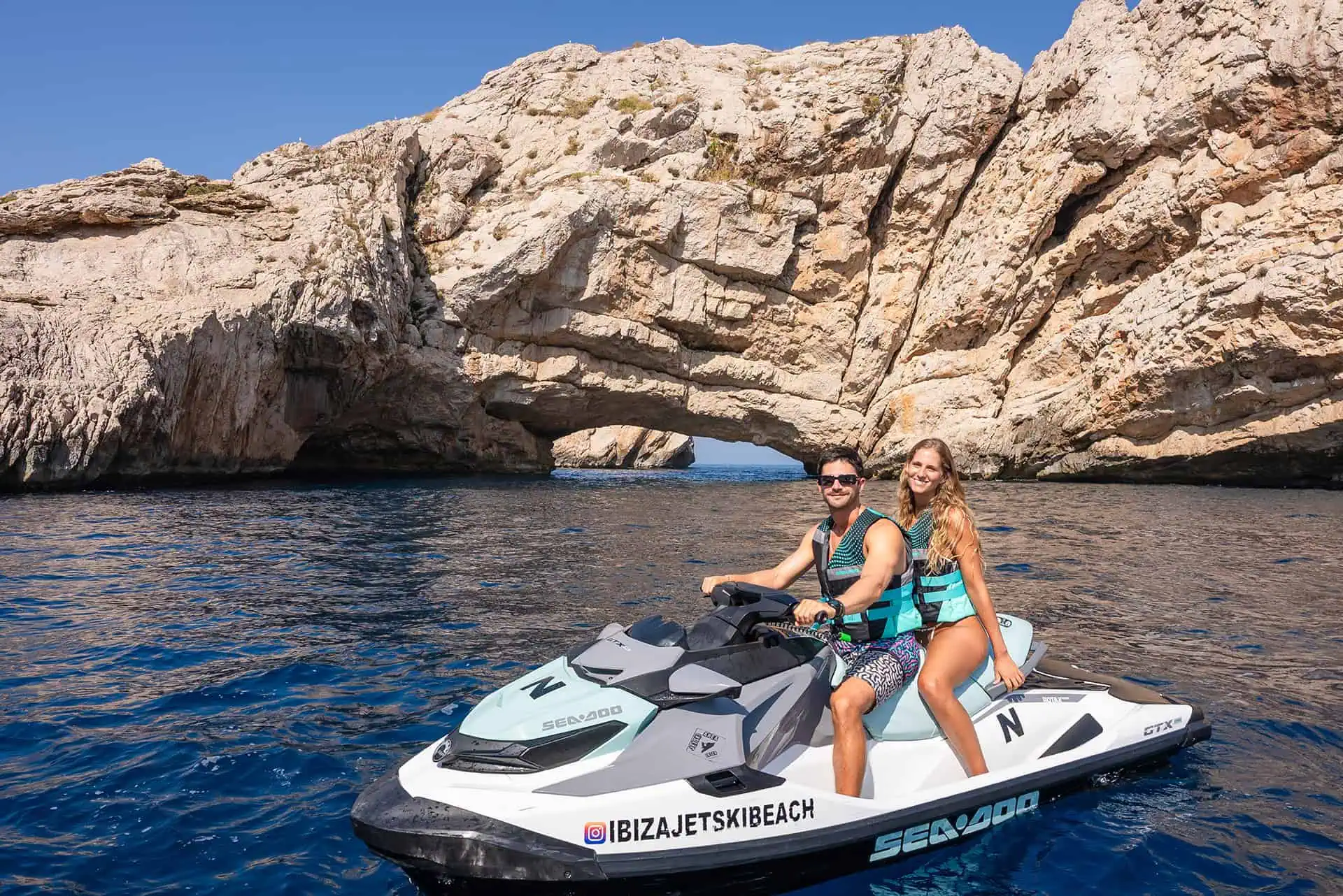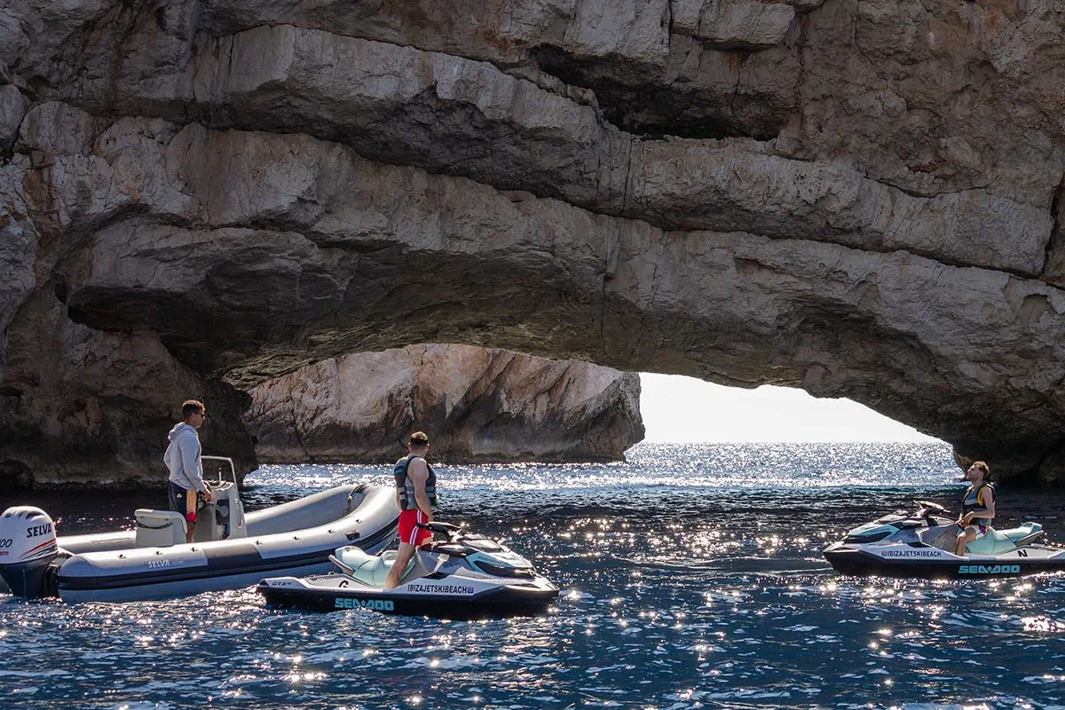 Use our promotional code IBIZAJETSKI to get a discount on your Ibiza jet ski excursion bookings.Characterized by its large natural arch, it makes the Isla Margarita jet ski excursion so special and one of our clients’ favorites. Crossing its arch and feeling the beauty of its surroundings make it an unforgettable experience. As we get closer we will be able to observe the other peculiarities that make this island one of the most beautiful in Ibiza. It is one of the postcard images that the north of the island has to offer, don’t miss yours on one of our new Sea Doo. It is also an island much appreciated by divers due to its fantastic seabed. This whole area of the coastline is wild and full of stunning cliffs.