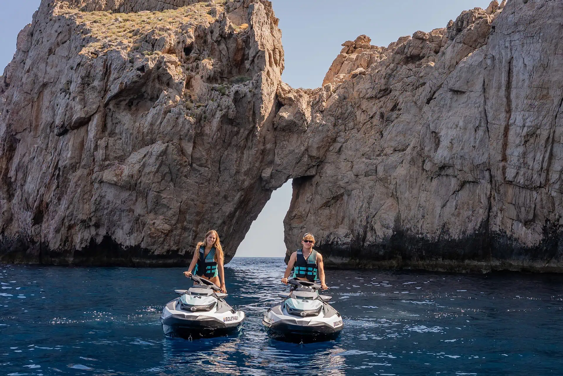 Being the most complete of our northbound routes, where we will have the opportunity to see different natural arches such as the beautiful Margarita Island and Punta de Ses Torretes, where we will find ourselves surrounded by cliffs of over 250 meters which makes it inaccessible by land. It is one of the wildest places on the island, being one of the postcard images offered by the north of the island, do not miss yours on one of our new Sea Doo.